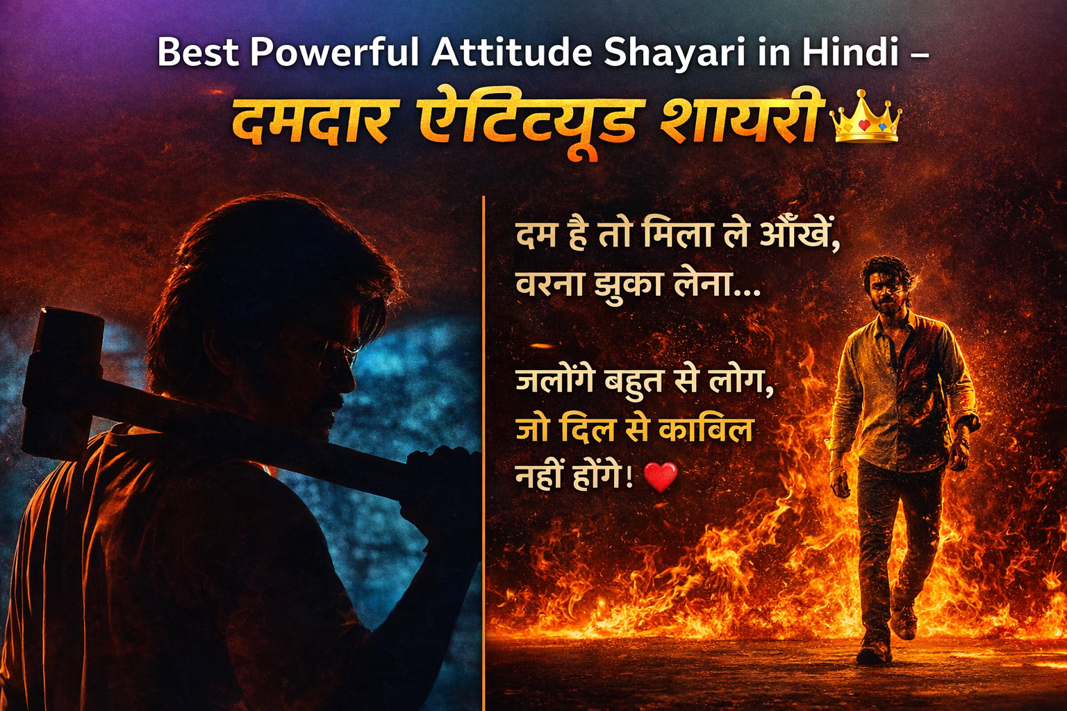 वैसे अगर आप Attitude से हटकर दिल को छू जाने वाली शायरी पढ़ना चाहते हैं, तो हमारी Romantic Love Shayari in Hindi Collection भी आपको ज़रूर पसंद आएगी 💕